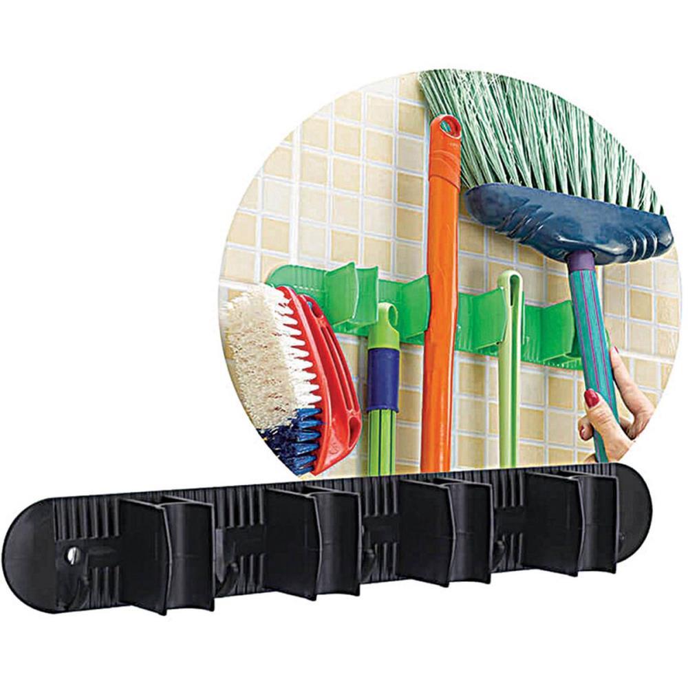 Este suporte possui quatro encaixes que acomodam vassouras, rodos e outros cabos de forma segura e acessível. Fabricado em material resistente, suporta o peso dos utensílios sem deformar ou danificar a parede. A cor preta confere um toque moderno e discreto, combinando com diversos estilos de decoração.