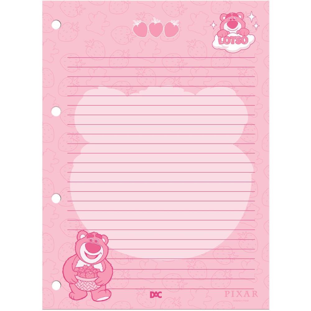 bloco para fichário lotso, folhas decoradas para fichário, refil fichário universitário dac, fichário toy story, folhas universitárias decoradas, papelaria fofa, folhas com gramatura 56g, fichário com folhas de personagem, papel lotso, refil para argolas, organização escolar, caderno personalizado, bloco universitário lotso, acessórios escolares disney, papelaria criativa, kit estudo lotso, folhas temáticas para planner, TK Shopping papelaria