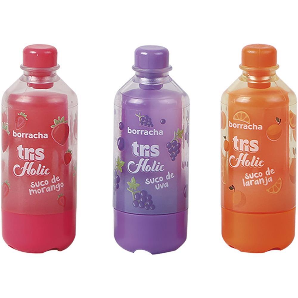 borracha decorada tris suquinho, borracha em formato de garrafinha, borracha criativa escolar, borracha coleção lanchinhos, borracha divertida com capa, borracha macia sortida, borracha display 24 unidades, borracha temática de suco, borracha para papelaria criativa, borracha infantil divertida