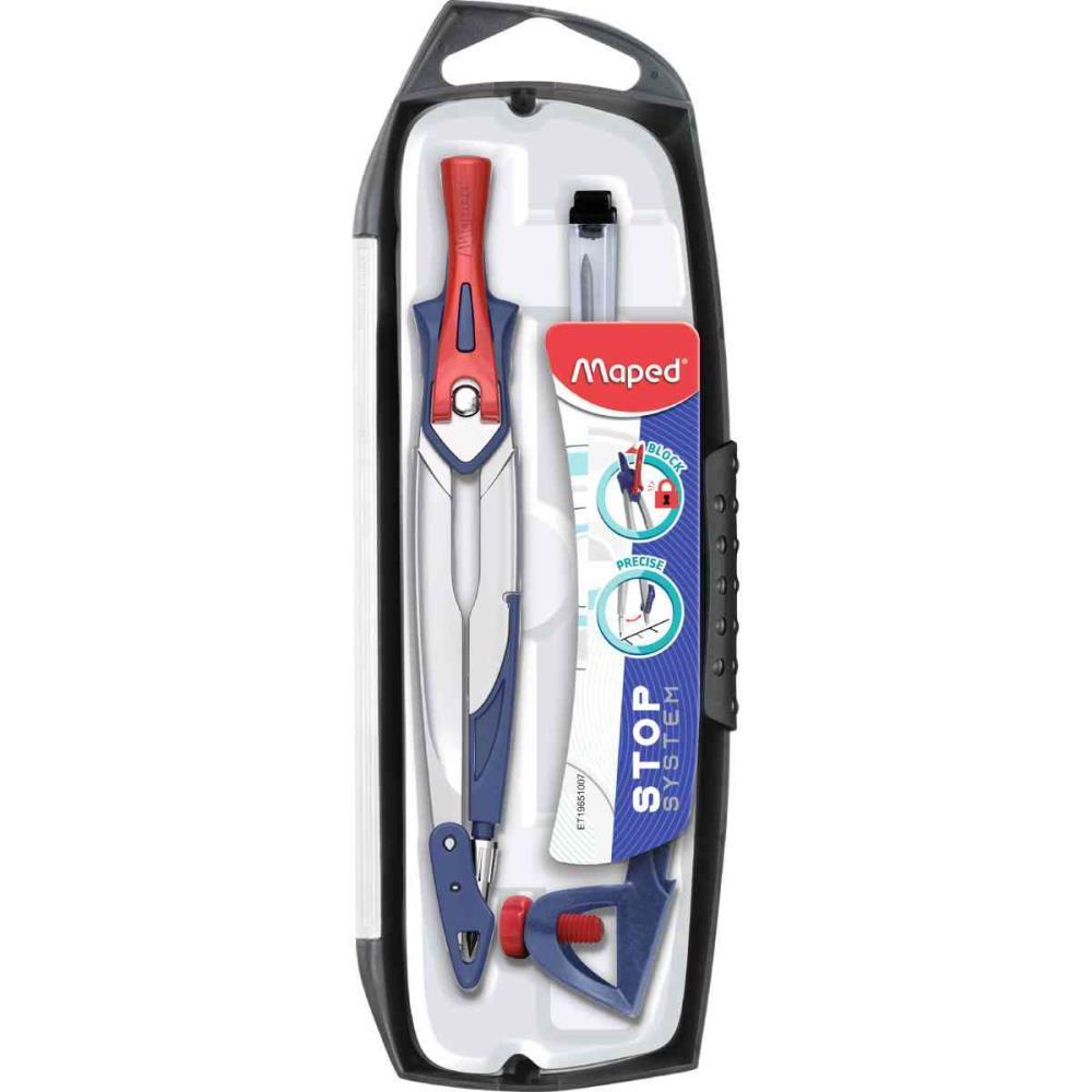 O Compass Stop System Maped e um compasso metalico indicado para uso escolar, com foco em praticidade e precisao no dia a dia. Possui sistema de travamento que mantem a abertura fixa apos o ajuste, facilitando o tracado de circulos com mais controle e menos erros. O manuseio e simples e intuitivo, adequado para estudantes do ensino fundamental e medio. Conta com capa protetora, que protege a ponta e o grafite, oferecendo mais seguranca no transporte e no armazenamento. Produto de marca reconhecida, com boa aceitacao no ponto de venda e indicado para papelarias que buscam um item funcional, confiavel e de facil reposicao de estoque.
