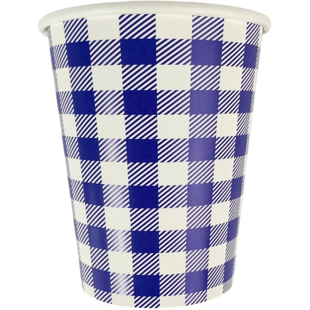 O Copo de Papel Xadrez combina praticidade e estilo para servir seus convidados com todo o charme do campo. Com estampa classica xadrez em azul e branco, remete as toalhas de piquenique e a decoracao rustica das quermesses, sendo perfeito para bebidas, caldos ou pipoca de forma criativa. Feito em papel, e uma opcao segura e mais sustentavel para festas com criancas ou grande fluxo de pessoas. Alem de funcional, valoriza a decoracao da mesa, trazendo padronizacao e beleza ao seu Arraia.