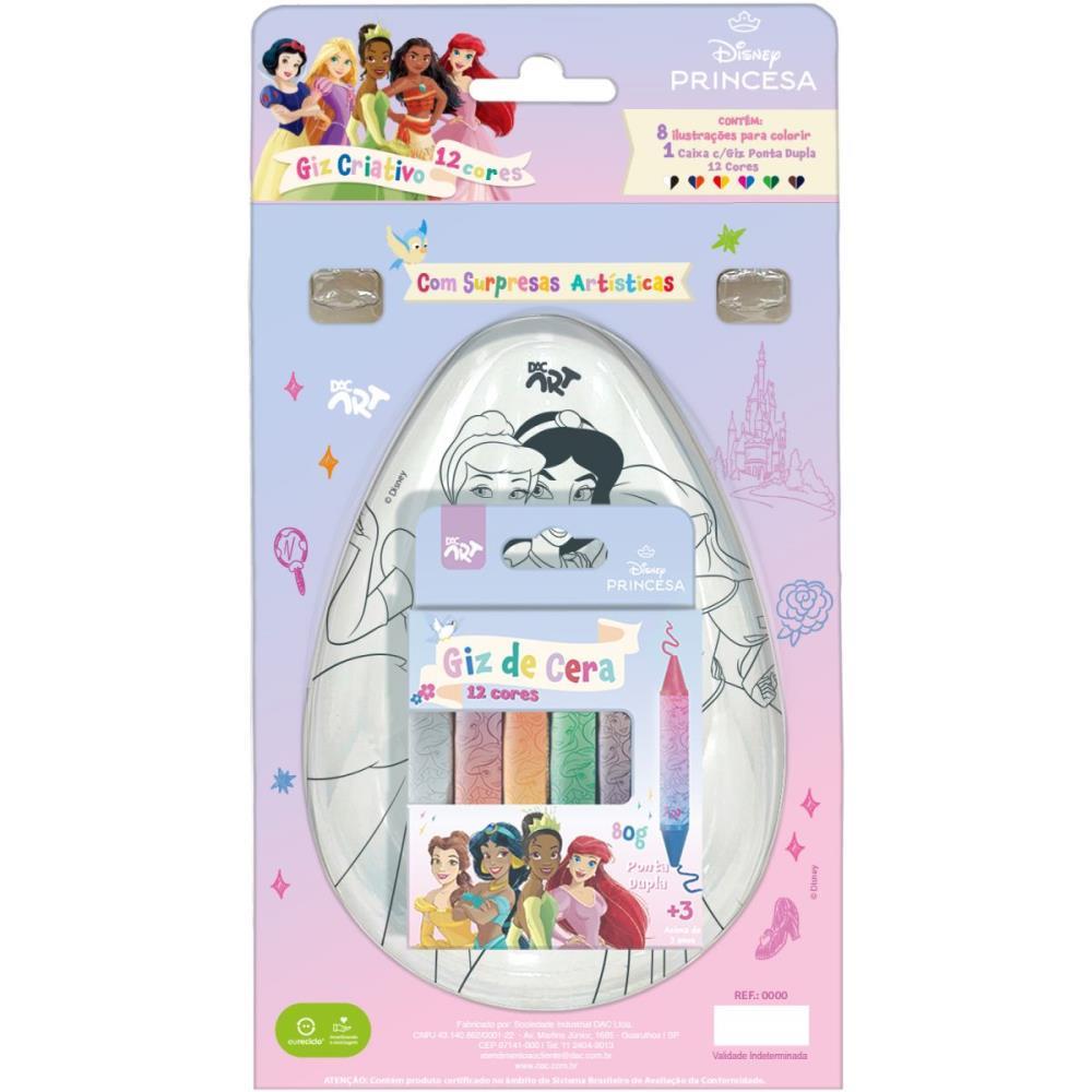 Giz Criativo DAC Princesas Com formato exclusivo de Ovo de Pascoa, o Giz Criativo DAC e composto por 8 folhas de pintura com a tematica Princesas e 6 gizes de cera com ponta dupla, oferecendo 12 cores diferentes, acondicionado em embalagem de acetato transparente. Indicado para atividades criativas, recreativas e educativas, sendo uma otima opcao para presentear. Com solapa para melhor exposicao no PDV.