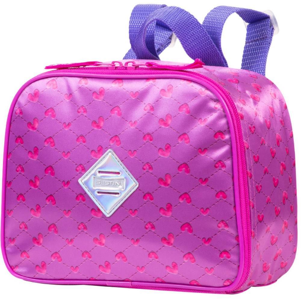 A lancheira que completa a colecao Arco Iris 2, com a mesma estampa colorida e detalhes em coracoes. Com um revestimento interno resistente a liquidos e facil de limpar, ela tambem conta com alcas de costas com regulagem e alca carona para ir encaixada no carrinho da sua mochila.
