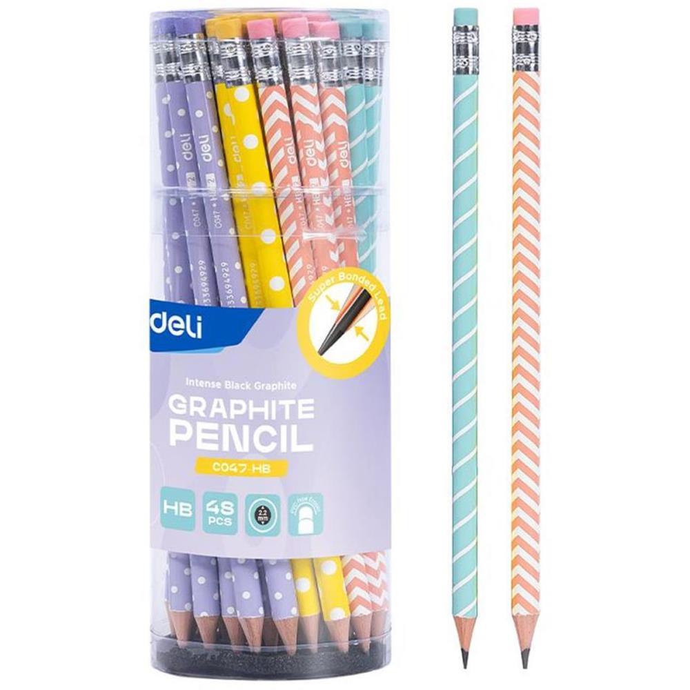 lápis preto decorado, lápis hb com borracha, lápis redondo deli, lápis escolar estampado, lápis listras e bolinhas, lápis hb tk shopping, pote com 48 lápis, lápis decorado infantil, lápis escritório, lápis para escola, lápis resistente, lápis confortável, lápis hb econômico, lápis decorado sortido, lápis com design divertido