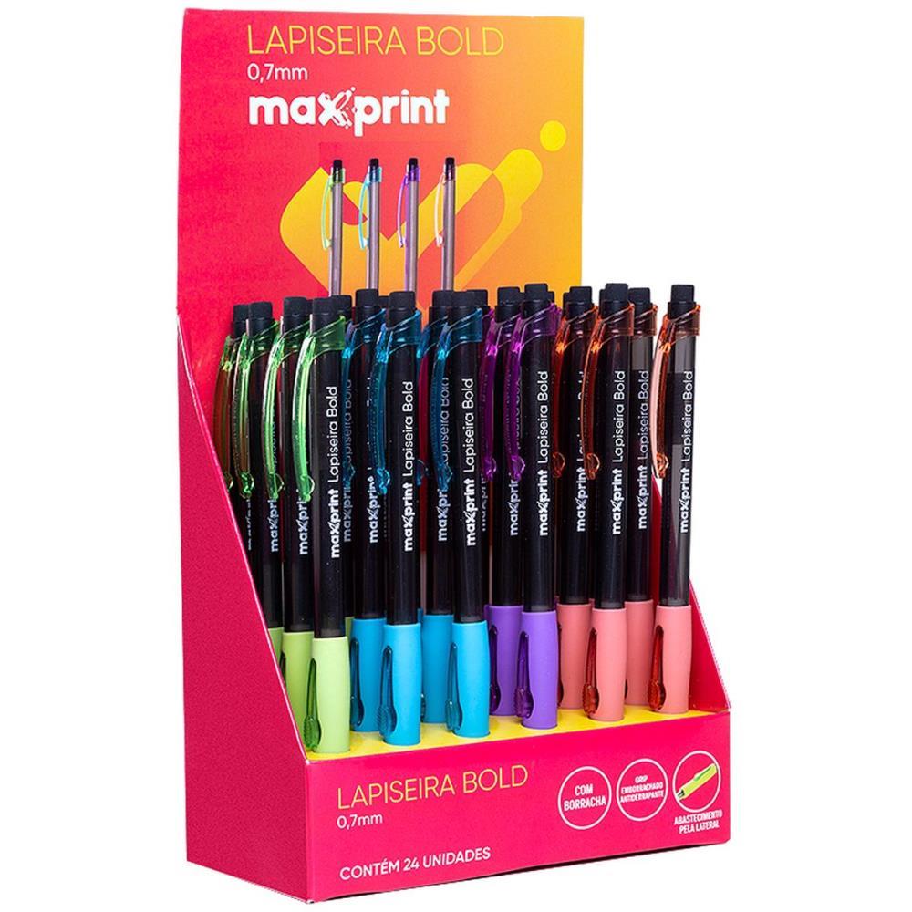 lapiseira 0.7mm, lapiseira Bold, lapiseira Maxprint, lapiseira com borracha, lapiseira com grip emborrachado, lapiseira neon, lapiseira preta, lapiseira colorida, lapiseira com ponta retrátil, lapiseira de alta qualidade, lapiseira durável, lapiseira prática, lapiseira para estudantes, lapiseira para escritório, lapiseira para artistas, lapiseira com estrutura metálica, lapiseira certificada pelo Inmetro, lapiseira confortável, lapiseira moderna, lapiseira de design estiloso, lapiseira para escrita precisa, display com 24 lapiseiras