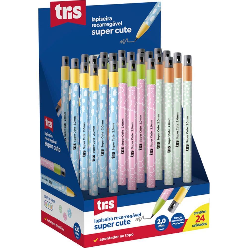 lapiseira 2.0mm, lapiseira Tris Super Cute, lapiseira retrátil com apontador, lapiseira colorida, lapiseira TK Shopping, lapiseira resistente, lapiseira escolar, lapiseira para crianças, lapiseira com ponta reforçada, display de lapiseiras, lapiseira com estampas variadas, lapiseira com traço grosso, lapiseira para iniciantes, lapiseira para escrita firme