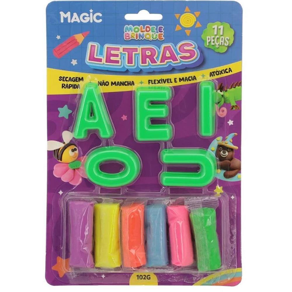 O kit acompanha 6 potes de massinha colorida e 5 moldes temáticos de letras, permitindo que as crianças aprendam o alfabeto enquanto criam palavras, figuras e histórias com suas próprias mãos. A massa é atóxica, flexível, macia e possui secagem rápida, garantindo segurança e praticidade durante o uso.