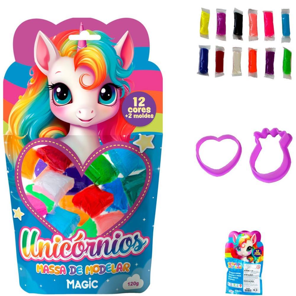 massa para modelar, unicórnios, kit de modelar, 12 cores de massa, moldes de unicórnios, brinquedo educativo, criatividade infantil, atividade lúdica, TK Shopping.
