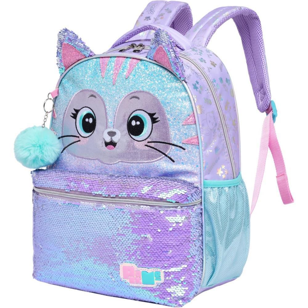 Colecao confeccionada em foil prata iridescente em impressao corrida no Nylon. Painel frontal com gradiente em PU branco com glitter. Orelhas em lantejoulas 3D com detalhes em PU com glitter aplicado no topo do paine frontal. Detalhes da face do gato em patches de PU com glitter com bordado nas bordas. Bochechas em impressao silk. Detalhes da face em bordado com alto relevo. Puxadores de ziper de metal iridescente. Bolso frontal em lantejoula reversivel LILÁSiridescente. Chaveiro com pompom no bolso frontal. Patch de PVC prata iridescente com logo em relevo. Etiqueta de identificAÇÃO no painel traseiro.
