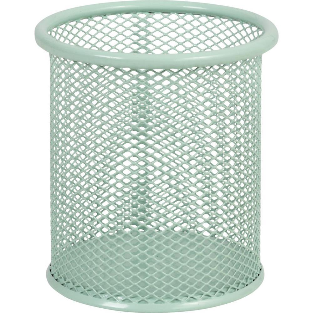 acessório de mesa, porta-canetas aramado, aramado verde pastel, organização de mesa, organizador de canetas, acessório para escritório, porta-lápis moderno, acessório de mesa elegante, porta-canetas resistente, acessório para home office, porta-canetas redondo, acessório verde pastel, decoração de mesa, acessório de mesa durável, organizador compacto
