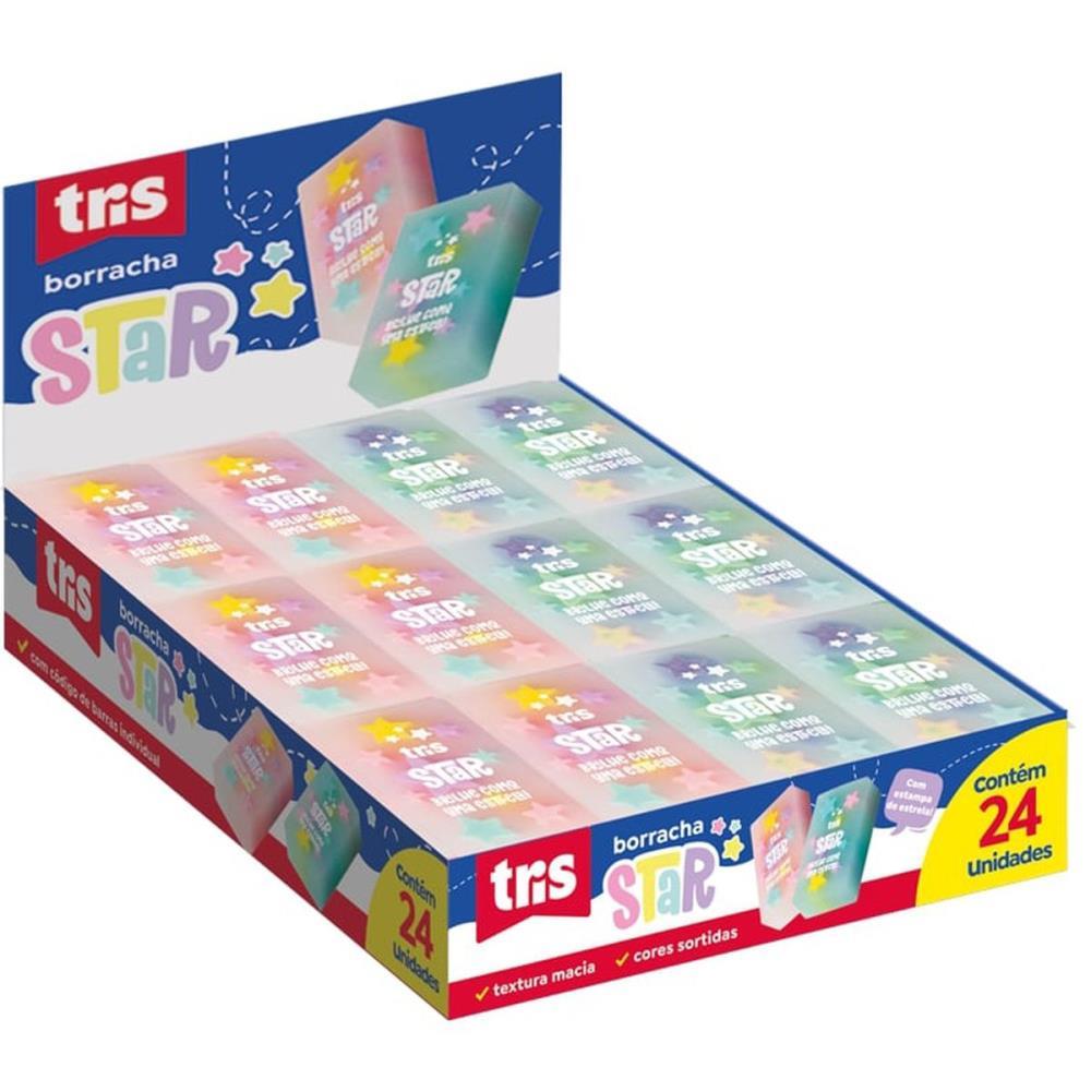 borracha decorada, borracha Tris Star, borracha macia, borracha escolar, borracha para escritório, borracha para desenho, borracha divertida, pacote com 24 borrachas, borracha de qualidade, borracha durável, borracha com textura macia, borracha para estudantes, borracha eficiente, borracha decorada Tris, material escolar divertido.