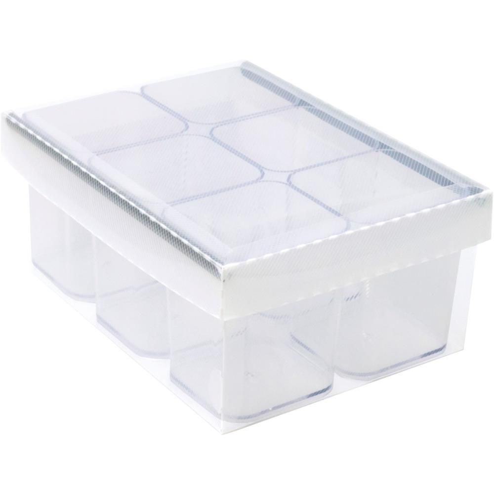A Caixa Organizadora de Objetos possui fundo e tampa fabricados em polipropileno, e acompanha 6 porta-objetos fabricados em poliestireno.