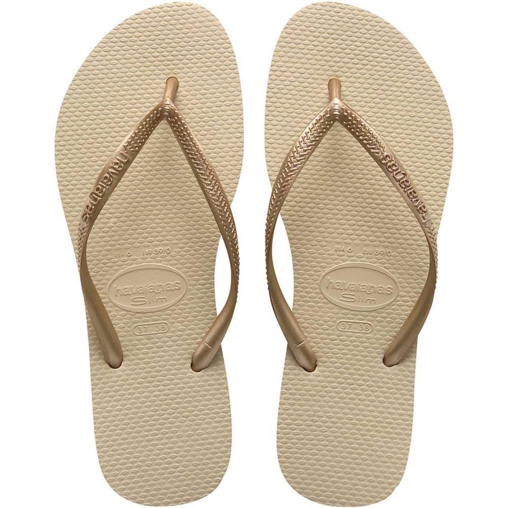 chinelo Havaianas, Havaianas Slim, chinelo feminino, chinelo areia/dourado, Havaianas confortável, chinelo elegante, sandália Havaianas, moda casual, calçado confortável, chinelo para praia
