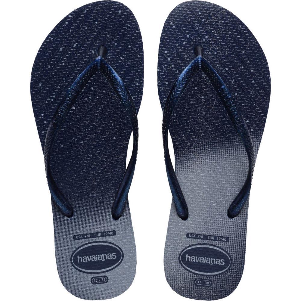 chinelo feminino, Havaianas Slim Gloss, chinelo com glitter, chinelo marinho, chinelo estiloso, chinelo confortável, moda praia, TK Shopping, chinelo Havaianas, chinelo glamouroso, chinelo versátil