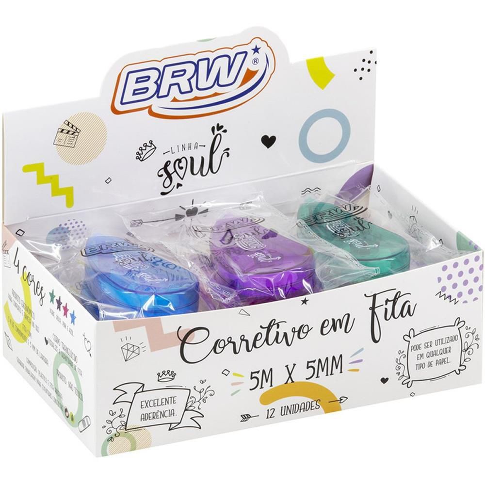 corretivo em fita, corretivo soul, corretivo BRW, corretivo colorido, corretivo 5mm, corretivo 5m, corretivo sortido, corretivo escolar, corretivo para papel, corretivo seco, corretivo instantâneo, corretivo sem sujeira, corretivo moderno, corretivo colorido BRW, corretivo para caderno, display corretivo, TK Shopping papelaria, material escolar, corretivo de qualidade, corretivo prático
