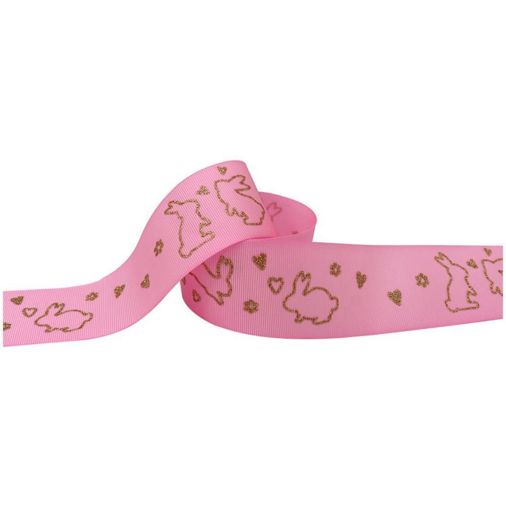 Fita de Gorgurão Páscoa 38MM 10M Coelho Rosa com Glíter