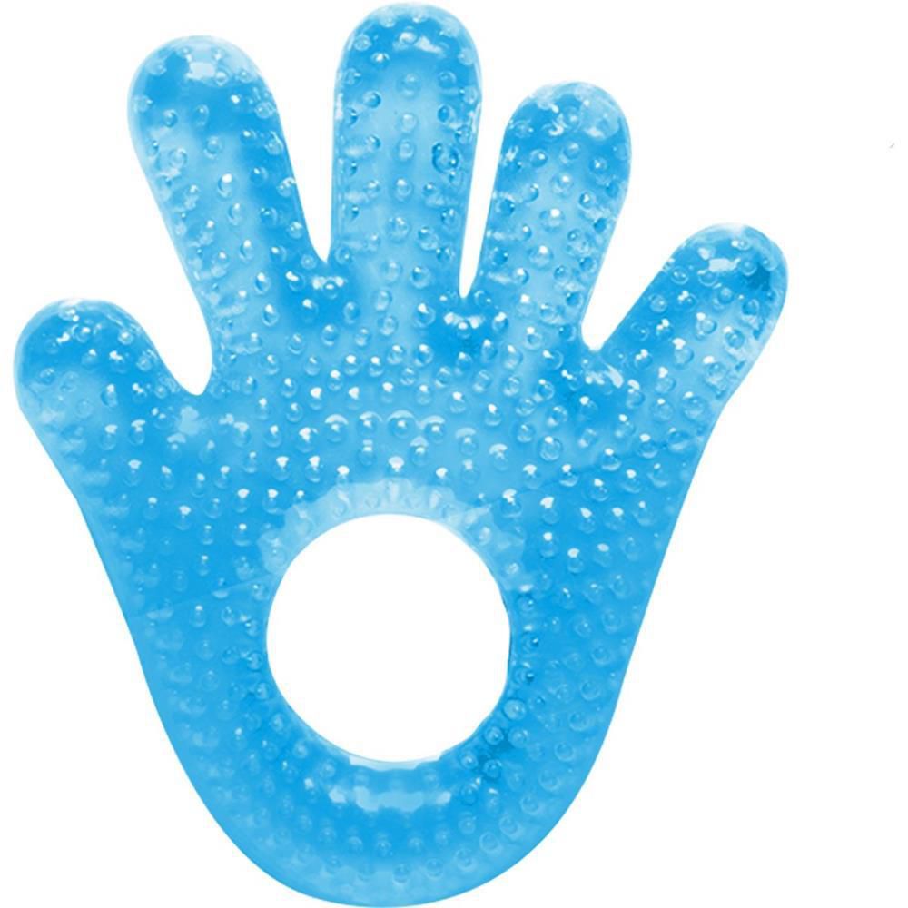 mordedor infantil, mordedor mãozinha, mordedor azul, mordedor com água, alívio dentição, massageador de gengivas, mordedor seguro, mordedor para bebês, acessório de dentição, mordedor portátil