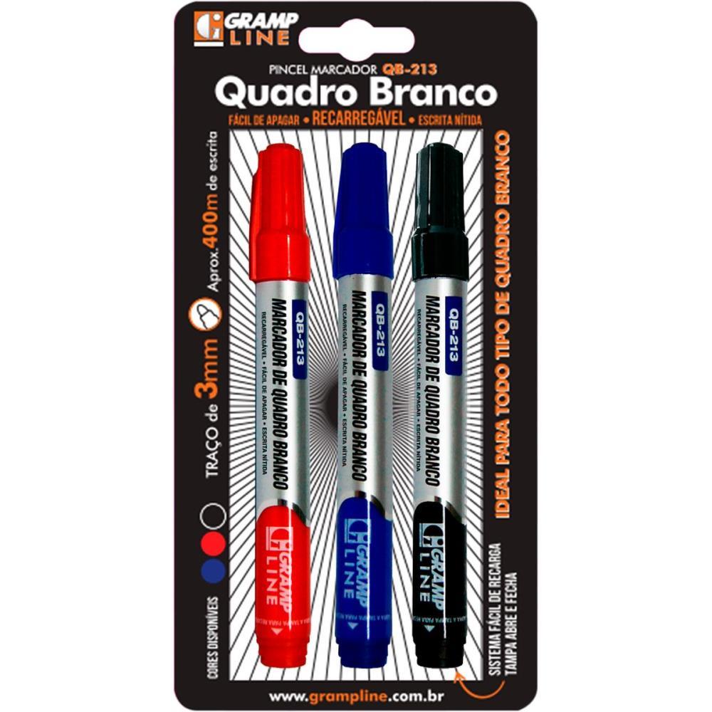 pincel marcador, quadro branco, QB-213, recarregável, azul, preto, vermelho, ponta acrílica, traço 2-3 mm, tinta à base de álcool, fácil remoção, baixo odor, atóxico, Gramp Line, sistema de recarga, material escolar, escritório, apresentações, aulas, sustentabilidade, economia, praticidade, durabilidade, cores vibrantes, escrita suave, fácil manutenção, saúde, segurança, embalagem blister, conjunto 3 cores