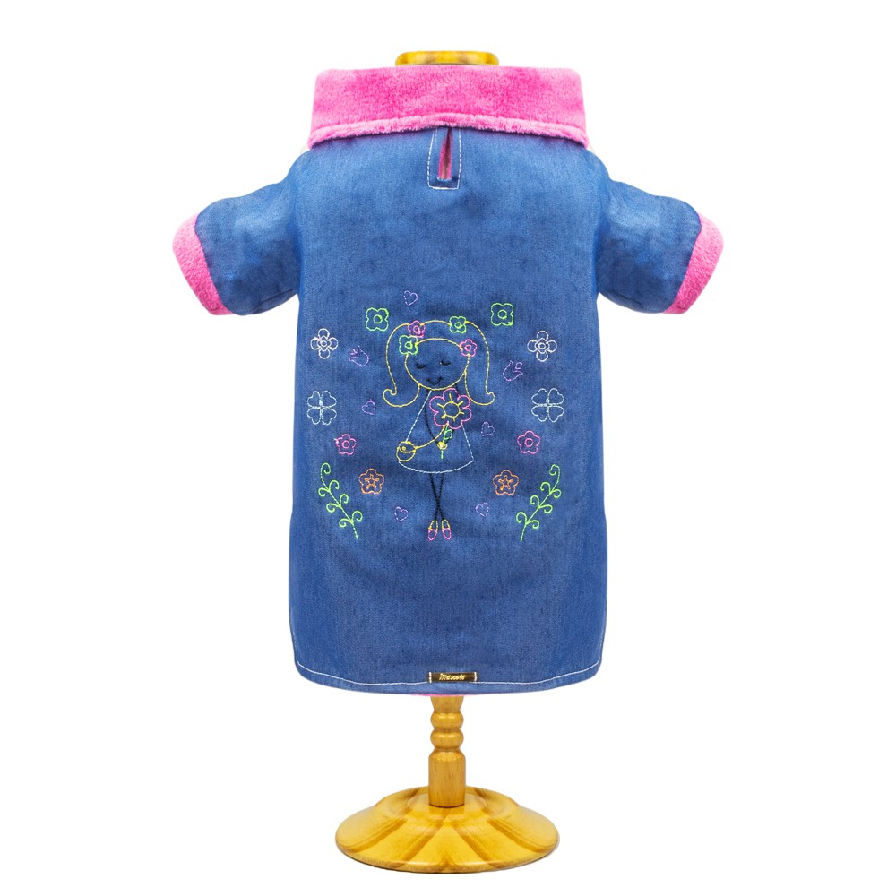 Confeccionada em Jeans, forrada em Fleece e com detalhes em bordado.